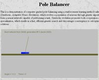 Балансировка шеста Апплет, демонстрирующий применение Генетического Программирования. Нейронная сеть управляет тележкой с которой через шарнир соединет шест, находящийся в состоянии неустойчивого равновесия. Подробнее |