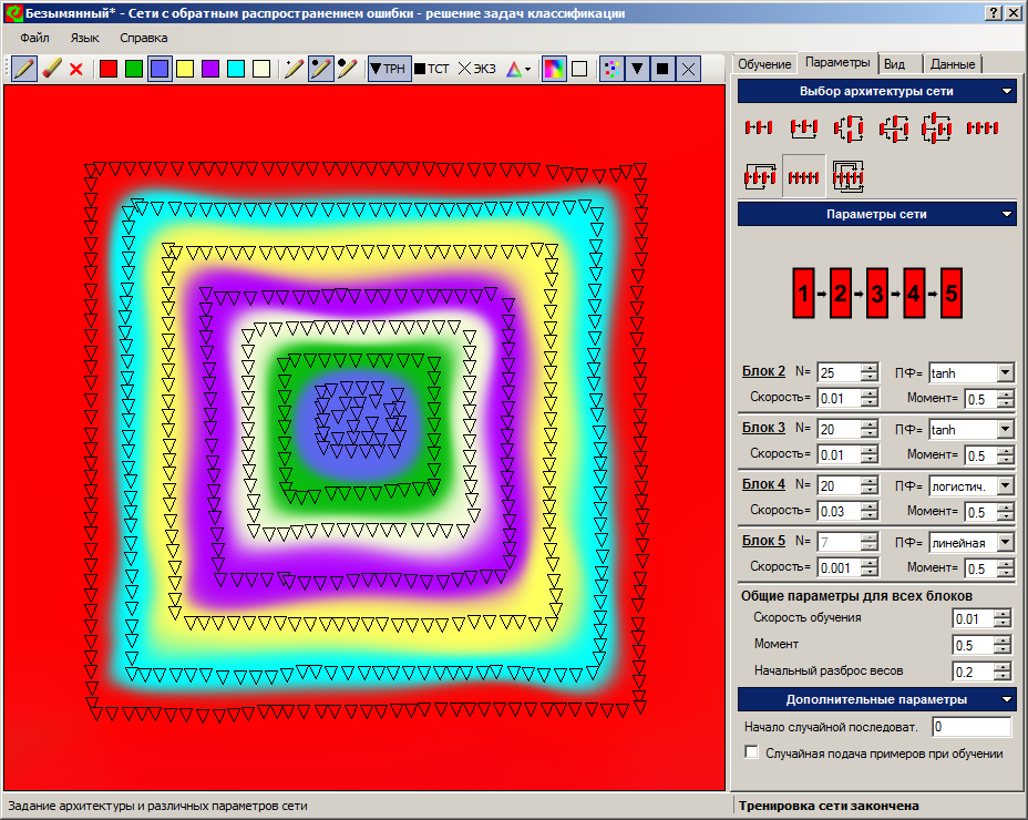 Значками на основном поле показаны точки заданных наборов данных, цвет поля соответствует результатам применения текущей сети (см. рисунок). В процессе обучения периодически происходит повторное применение сети и перерисовка поля, что позволяет наглядно видеть, как обучается сеть.