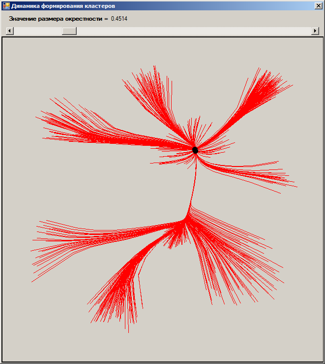 Для ответа на этот вопрос в программе применён специальный алгоритм. Его работа основана на расчёте средневзвешенного значения активностей всех нейронов натренированной сети для одной из точек плоскости. Это значение зависит от так называемого радиуса стягивания, определяющего характерное растояние, на котором "ощущается притяжение" нейрона. На основании полученного средневзвешенного значения по специальной формуле рассчитывается новое положение точки, после чего процедура повторяется.