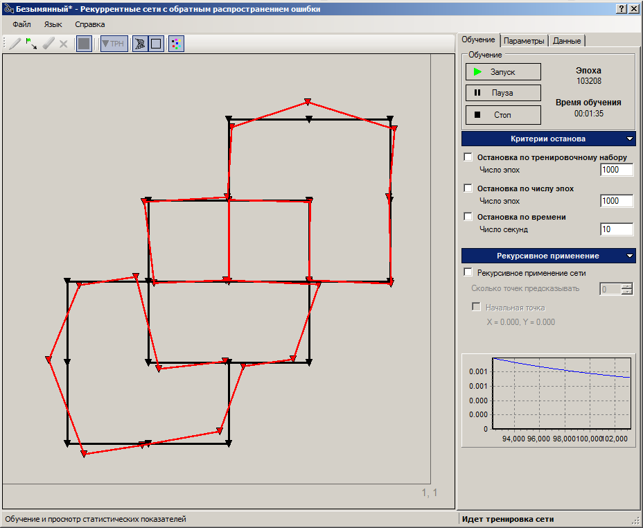 На экране отображаются две траектории: исходный набор данных (чёрная) и результат применения сети (красная). Программа позволяет отображать результат применения сети в двух режимах. В первом режиме для получения каждой следующей точки траектории на вход сети подаются истинные (желаемые) координаты предыдущей точки. Как правило, правильная или почти правильная треаектория в этом режиме начинает воспроизводиться достаточно быстро (см. рисунок).