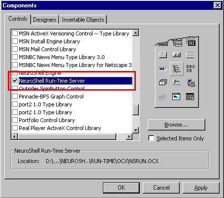 Для активизации Ваших сетей в своих программах Вы можете использовать элемент управления NeuroShell® ActiveX Control. Для этих целей годятся любые языки программирования, которые позволяют вставлять элементы управления. Например, если Вы пользуетесь языком Visual Basic, то сначала Вам следует добавить контрольный элемент на панель инструментов. Выберите в меню Project пункт Components, найдите в списке компонентов NeuroShell Run-Time Server и включите флажок. После того, как Вы включите флажок и нажмете OK, к панели инструментов Вашего проекта VB будет добавлен значок . Теперь Вы сможете поместить в форму элемент управления, активизирующий Ваши нейронные сети, точно так же, как Вы сделали бы это для любого другого элемента управления.