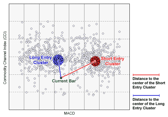 Предположим, у вас есть два хороших индикатора. Нанесем на плоскость точки, соответствующие некоторому временному периоду, взяв по осям значения этих двух индикаторов. Предположим, что ваши индикаторы настолько хорошо описывают состояние рынка, что в результате на плоскости образуются два хорошо различимых кластера: один соответствующий хорошей возможности для игры на повышение, другой для игры на понижение. Можно предположить, что в зависимости от того, насколько ваша точка близка к одному из кластеров, вы можете сделать выводы о характере динамики рынка в данный момент.