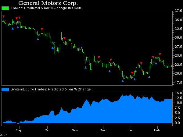 В этом примере мы использовали индикаторы MACD Signal, RSI и Williams %R в качестве входов нейронной сети для прогнозирования изменения цены открытия акций GM на 5 дней вперед. Генетический оптимизатор не использовался.