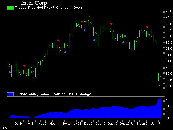 В этом примере мы использовали индикаторы Stochastic %K, Stochastic Slow %D и Williams %R в качестве входов нейронной сети для прогнозирования изменения цены открытия акций INTC на 5 дней вперед. Генетический оптимизатор не использовался.