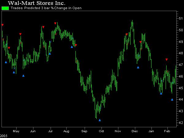 В этом примере в качестве входов нейронной сети использовались наклоны регрессионных линий в предыдущих точках. Прогнозировались цены открытия акций WMT на 3 дня вперед. Генетический оптимизатор не использовался.