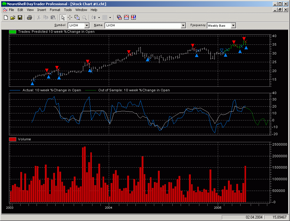 NeuroShell Trader умеет качественно строить прогнозы с помощью нейронных сетей. Используемая в NeuroShell Trader нейронная сеть Turboprop2 была разработана специально для финансового прогнозирования. Она умеет качественно экстраполировать, поэтому ее можно использовать на растущих рынках. Кроме того, Turboprop2 имеет механизмы, помогающие предотвратить "переучивание". Помимо этого, у Turboprop2 нет параметров, которые надо было бы подбирать, чтобы заставить сеть работать, что делает ее использование еще более простым. Вам не нужно становиться экспертом в нейронных сетях - использовать нейросетевое прогнозирование в NeuroShell Trader так же просто, как индикатор.