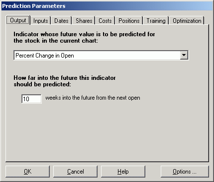 Выбрав пункт меню "Predictions"(Прогнозы), вы попадаете в Мастер Прогнозов(Prediction Wizard), позволяющий быстро настроить систему для получения прогнозов. Мастер прогнозов позволяет выбрать, что Вы хотите прогнозировать. Это могут быть цены закрытия (close), их процентные изменения или иные данные или индикаторы. Вы также можете устанавливать длительность периода, на который вы желаете получить прогноз. И больше никаких забот о создании данных с опережениями (lead) и задержками (lag) - NeuroShell Trader все это сделает за Вас! Когда нейронная сеть применяется к Вашим данным и индикаторам, результаты появляются в виде дополнительного временного ряда подобно тому, как это происходит при добавлении любого другого индикатора или новых данных. Результаты затем можно использовать в качестве индикаторов или входов другой нейронной сети.