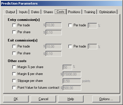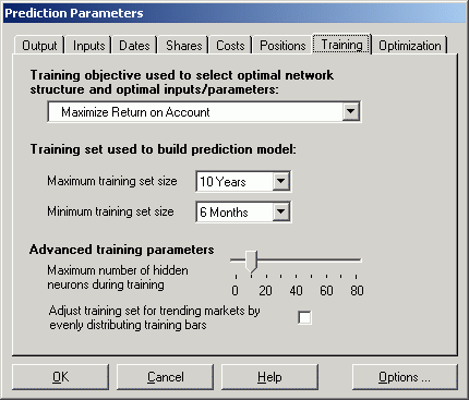 Многие трейдеры обращались с просьбой реализовать функциональность, позволяющую при прогнозировании ориентироваться на максимизацию прибыли вместо того, чтобы минимизировать ошибку прогнозирования. Это сделано! NeuroShell Trader позволяет Вам выбрать один из двух методов тренировки. Один метод минимизирует ошибку предсказания, а другой дает Вам возможность указать правила торговли и затем использует результаты торгов, основанные на предсказаниях сети, для максимизации прибыли. Т.к. при реальной торговле приходится учитывать комиссионные, проскальзывание и другие факторы, в NeuroShell Trader была реализована возможность обучать нейронную сеть максимизировать прибыль или другие целевые функции с учетом параметров торговли.