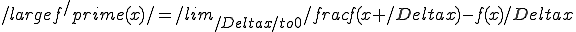 \large f^\prime(x)\ =\lim_{\Delta x\to0}\frac{f(x+\Delta x)-f(x)}{\Delta x}