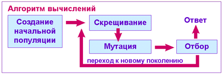 Чтобы смоделировать эволюционный процесс, сгенерируем вначале случайную популяцию - несколько индивидуумов со случайным набором хромосом (числовых векторов). Генетический алгоритм имитирует эволюцию этой популяции как циклический процесс скрещивания индивидуумов и смены поколений. ![]() Жизненный цикл популяции - это несколько случайных скрещиваний (посредством кроссовера) и мутаций, в результате которых к популяции добавляется какое-то количество новых индивидуумов. Отбор в генетическом алгоритме - это процесс формирования новой популяции из старой, после чего старая популяция погибает. После отбора к новой популяции опять применяются операции кроссовера и мутации, затем опять происходит отбор, и так далее. Отбор в генетическом алгоритме тесно связан с принципами естественного отбора в природе следующим образом: