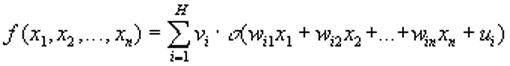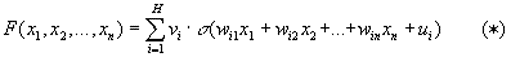 Пусть F(x1, x2, ..., xn) — любая непрерывная функция, определенная на ограниченном множестве, и e > 0 — любое сколь угодно малое число, означающее точность аппроксимации. Через "сигму" мы обозначаем сигмоидную функцию, определенную выше.