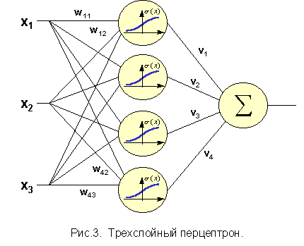 к этой сумме передаточную функцию и пересылает результат на один из входов нейрона третьего слоя. В свою очередь, нейрон выходного слоя суммирует полученные от второго слоя сигналы с некоторыми весами vi. Для определенности будем предполагать, что передаточные функции в скрытом слое являются сигмоидными, а в выходном слое используется функция p(x) = x, т. е. взвешенная сумма выходов второго слоя и будет ответом нейросети.